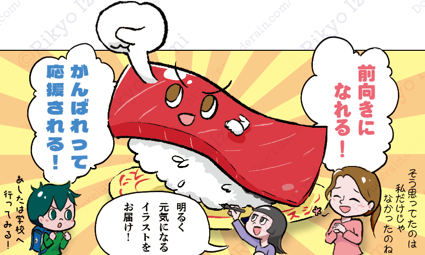 イラストのタッチは、主線の有るもの、無いものを交え、キャラクターは動きや表情を豊かにして飽きさせず、楽しくなるイラストを心掛けています。